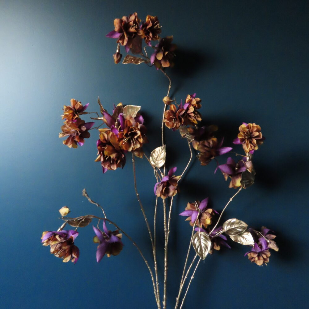 De sierlijke trossen met bloemen hebben bloemblaadjes in de warme kleuren paars, bruin en okergeel. In het hart van de bloem bevinden zich goudkleurige stampers die de bloemen doen schitteren. De elegante lange goudkleurige steel heeft 7 uitlopers met bloemen en blad van goud die een mooie zwierende houding hebben.