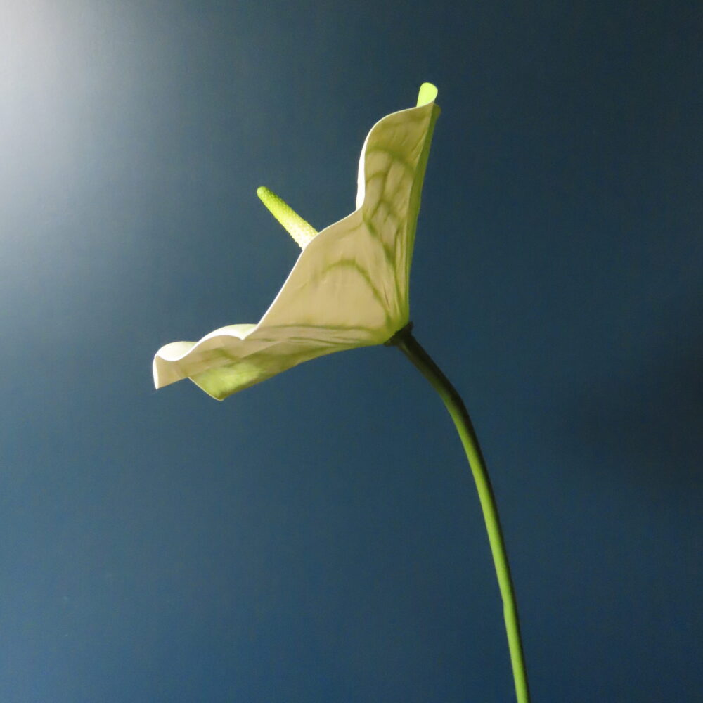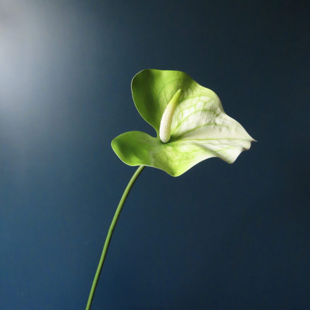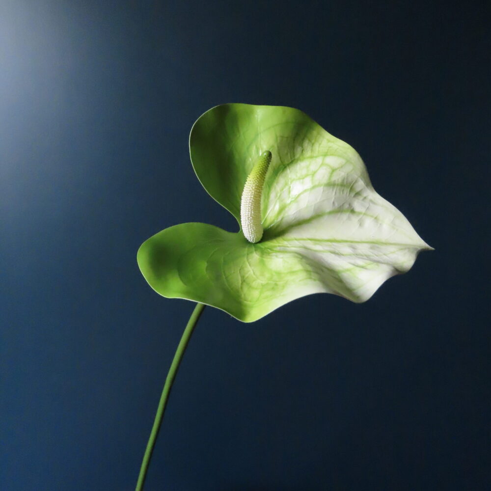 De Anthurium behoort tot de aronskelkfamilie en komt oorspronkelijk uit Zuid-Amerika. De getoonde kunst Anthurium heeft een grote hartvormige bloem waarvan het bloemblad groen/wit gekleurd is, de kleurschakeringen zijn goed zichtbaar aan de boven en onderkant van het blad. De imposante bloem (16 cm) staat op een ranke lange steel. Deze kleur Anthurium zal het bloemarrangement een frisse uitstraling geven.