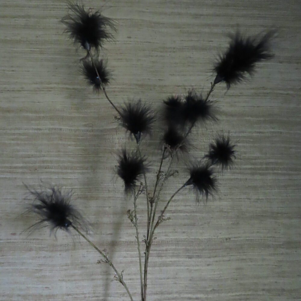 De blad tak goud heeft een zwarte steel met vertakkingen waar aan de uiteinde goudkleurige blaadjes bevinden, de 11 donzige Pom Pom’s dansen op de zwarte stelen die een ware blikvanger zijn.