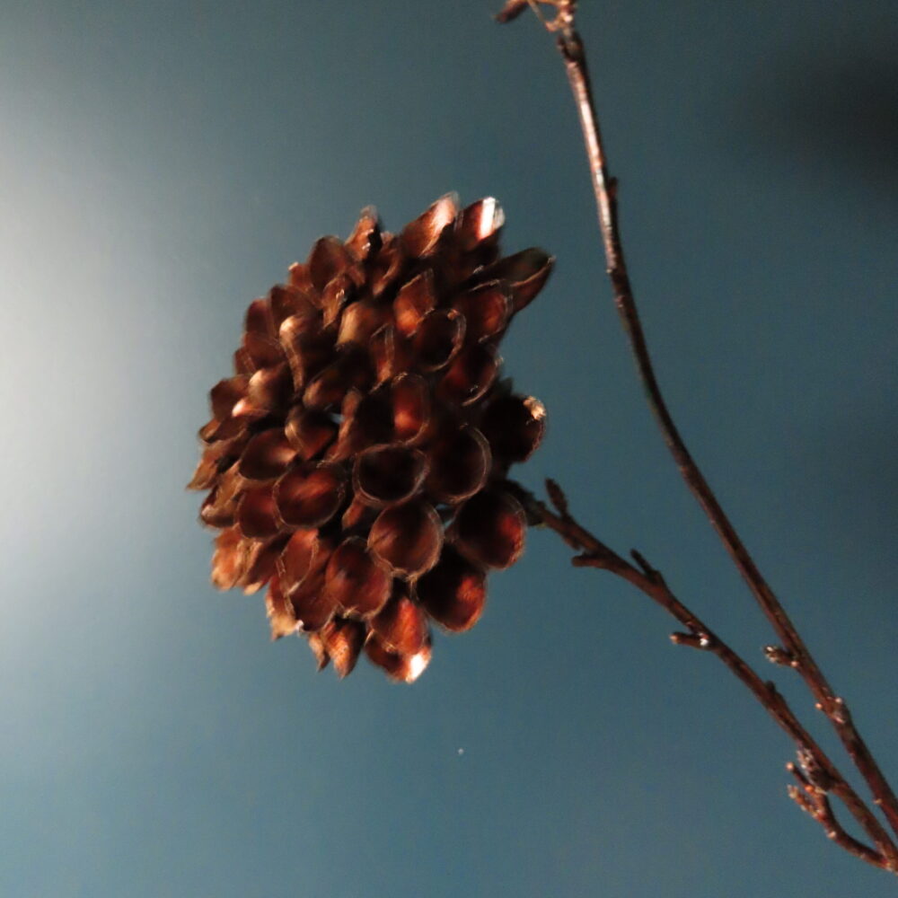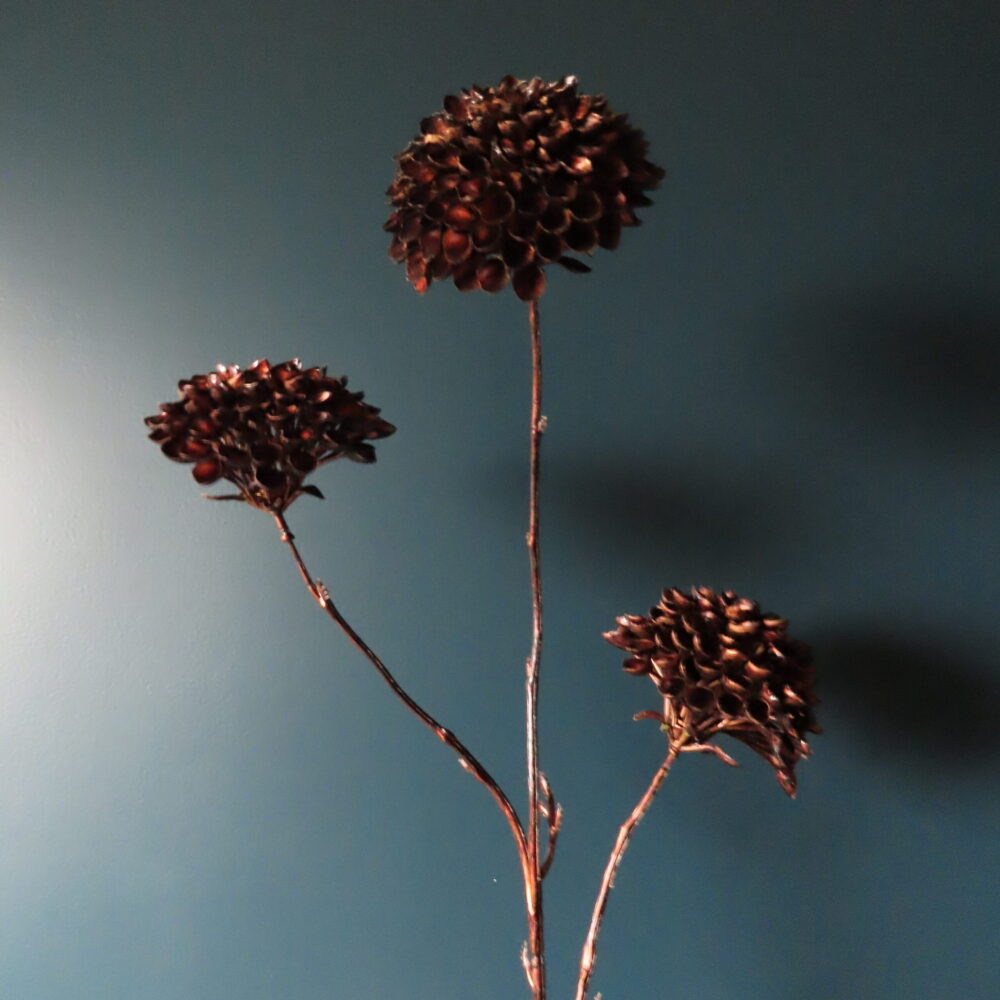 De bruin metallic gekleurde stelen hebben 3 stevige bollen met Dahlia bloemen die aan de buitenkant bruin gekleurd zijn, de binnenkant van het buisvormige bloemblad is brons gekleurd.