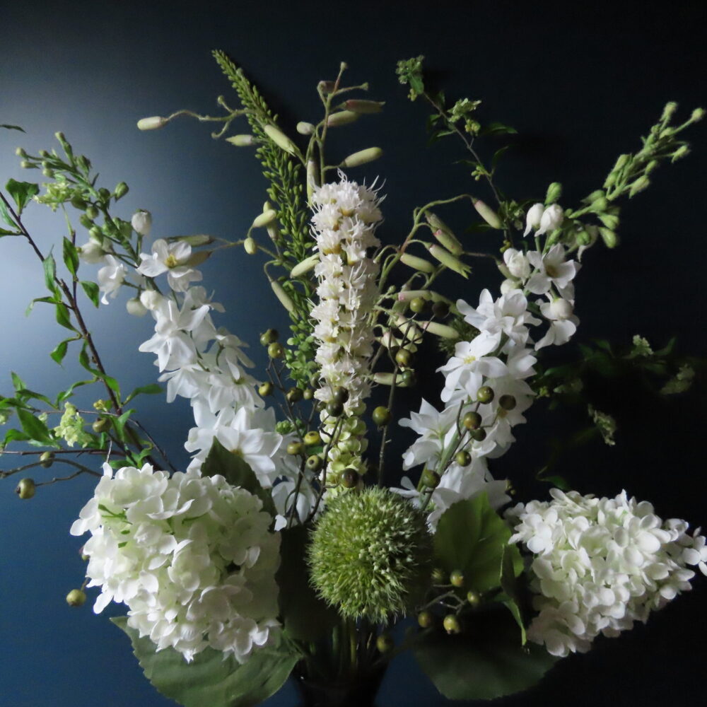Deze imposante kunst Delphinium heeft een lange steel met aan de onderkant van de bloemen gekruld bladgroen.