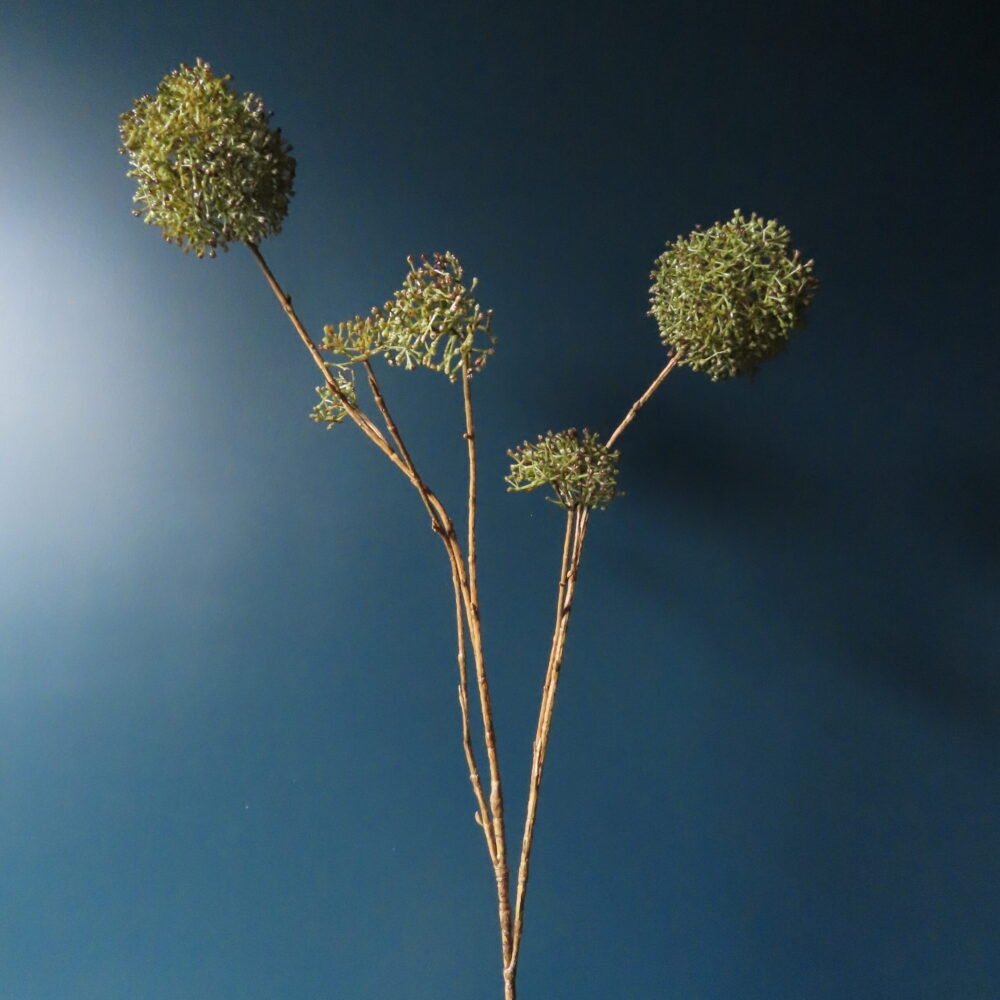 Deze kunst Eupatorium heeft meerdere vertakkingen waar grote en kleiner groene bloemhoofden aanzitten, de bloemhoofden zitten vol met kleine knopjes. Aan de lichtbruine stelen bevindt zich geen bladgroen.