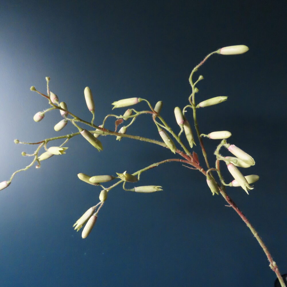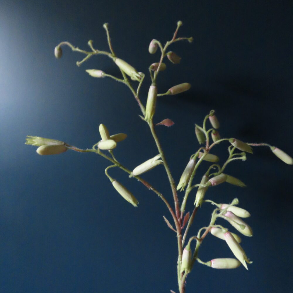 De getoonde kunst variant van de Kalanchoe is in de kleinste details zeer fraai uitgevoerd. De groene steeltjes zijn licht behaard de buisvormige klokjes zijn lichtgroen gekleurd, de rand van het klokje is gekarteld. De Kalanchoe kan het bloemarrangement een artistiek uiterlijk geven.