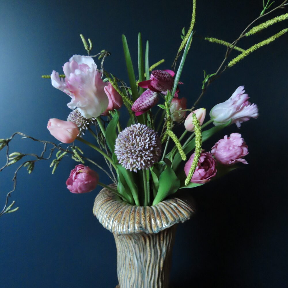 Voorjaar bloemarrangement bestaande uit diverse kunst Tulpen met Fritillaria, Hazelaar, Allium en Wilgen tak voorzien van groene bloeiende katjes, de stelen en bladgroen van de Tulpen zijn zeer fraai nagemaakt.