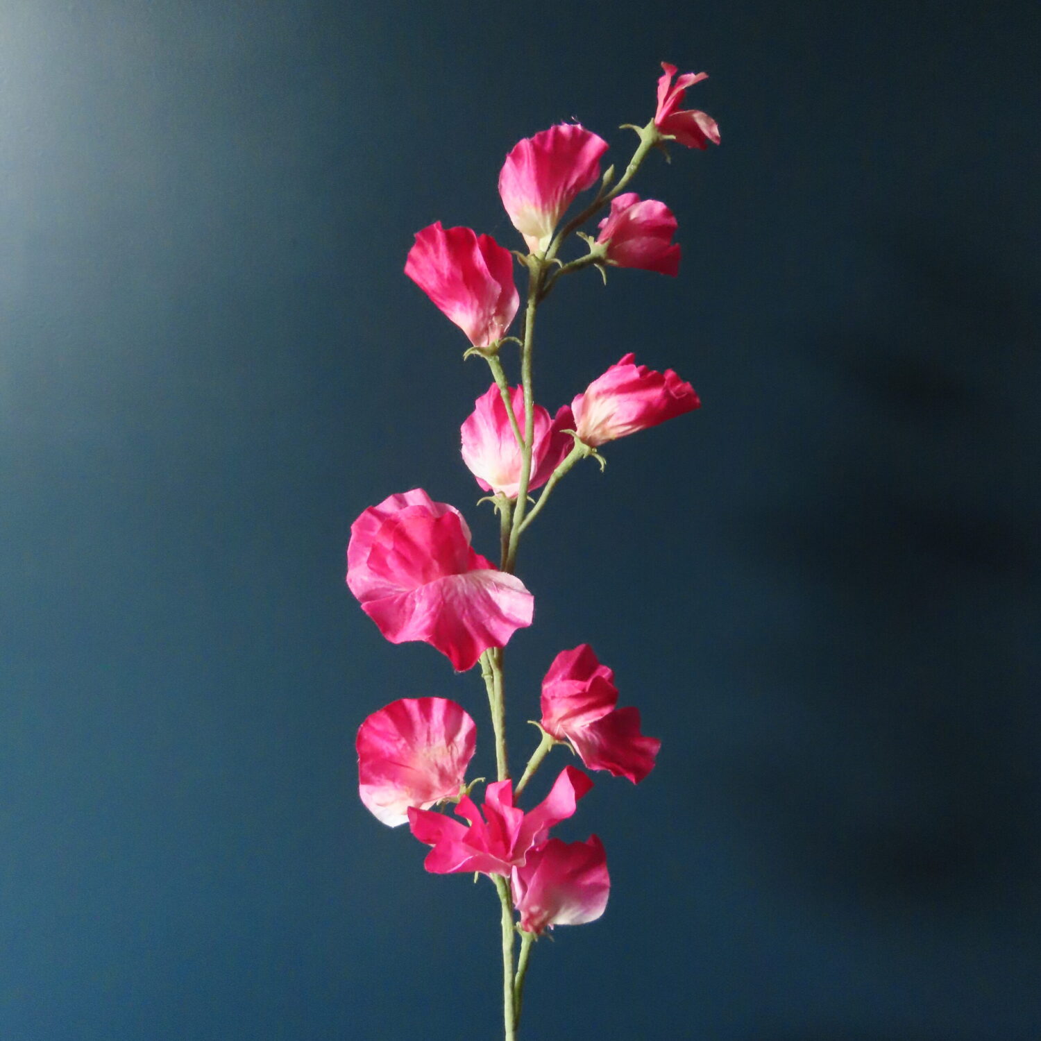 De Lathyrus plant komt uit de vlinderbloemenfamilie die voorkomt in Europa, Azië en Amerika, de plant staat bekend om zijn heerlijk geurende bloemen. De kunst zijde Lathyrus is verkrijgbaar met wit, paars, cerise, roze en perzikkleurige bloemen. De getoonde kunst tak is rijkelijk voorzien van bloemen de delicate bloemblaadjes zijn cerise gekleurd, aan deze tak zit geen bladgroen.