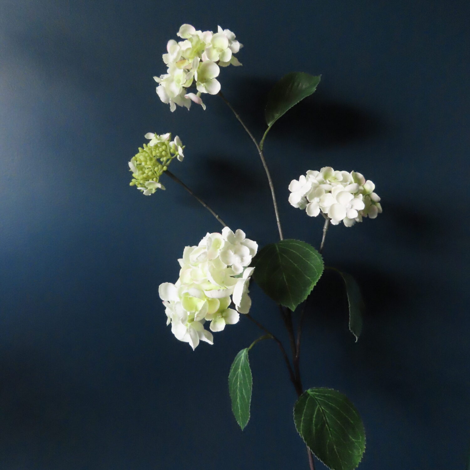 De Hortensia is een zeer geliefde heester die in verschillende varianten verkrijgbaar is. De getoonde Hortensia is de Bolhortensia deze heeft 4 bollen in verschillende maten. De Hortensia sneeuwballen bestaan uit witte bloemen en knopjes die voorzien zijn van lichtgroene accenten op het bloemblaadjes. De stelen zijn bruin de vertakkingen met bloemen zijn groen gekleurd, het bladgroen heeft een fraai nervenstructuur.